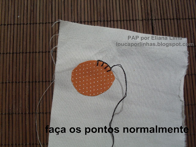 Aqui não dá nó, viu? A linha ficará presa pela cola quando você passar o trabalho a ferro, depois de pronto.